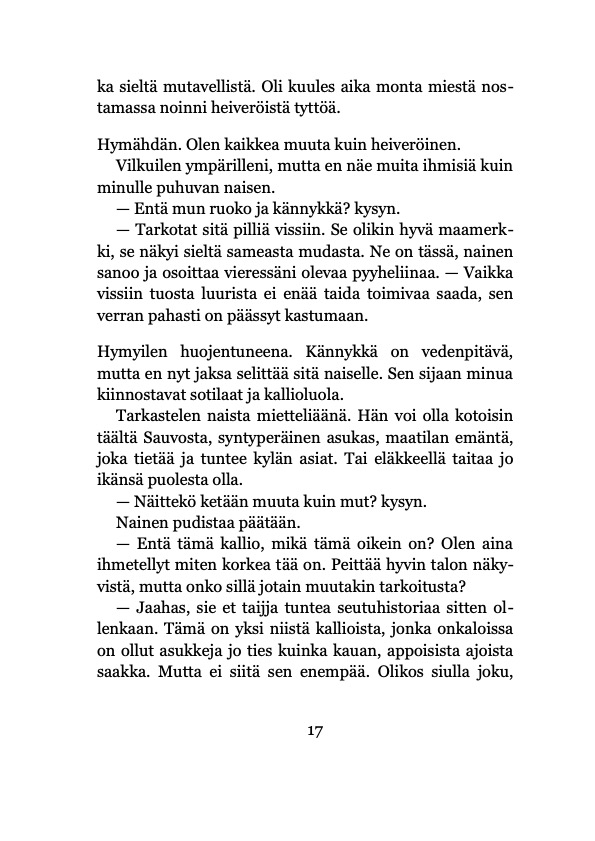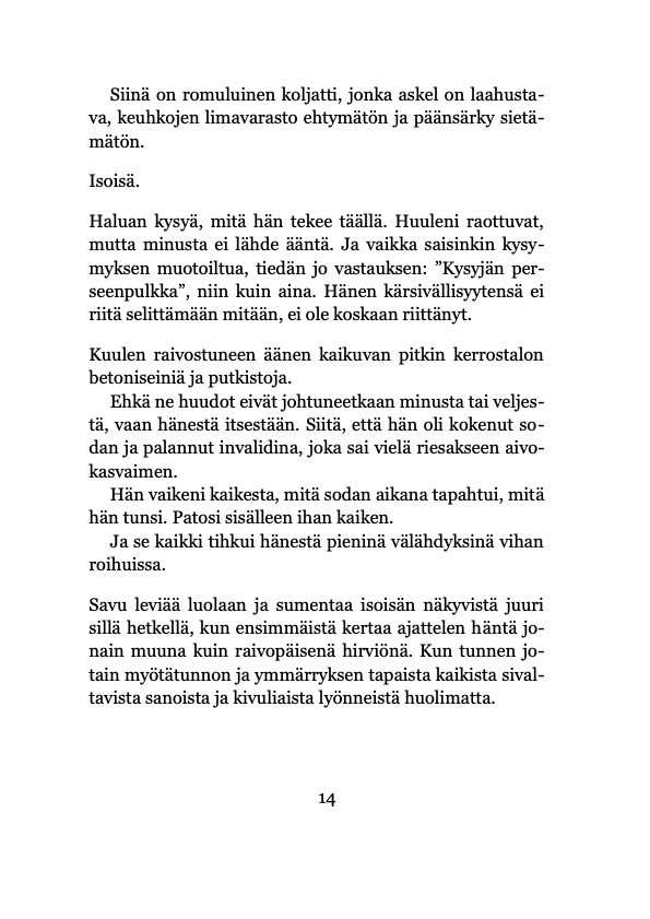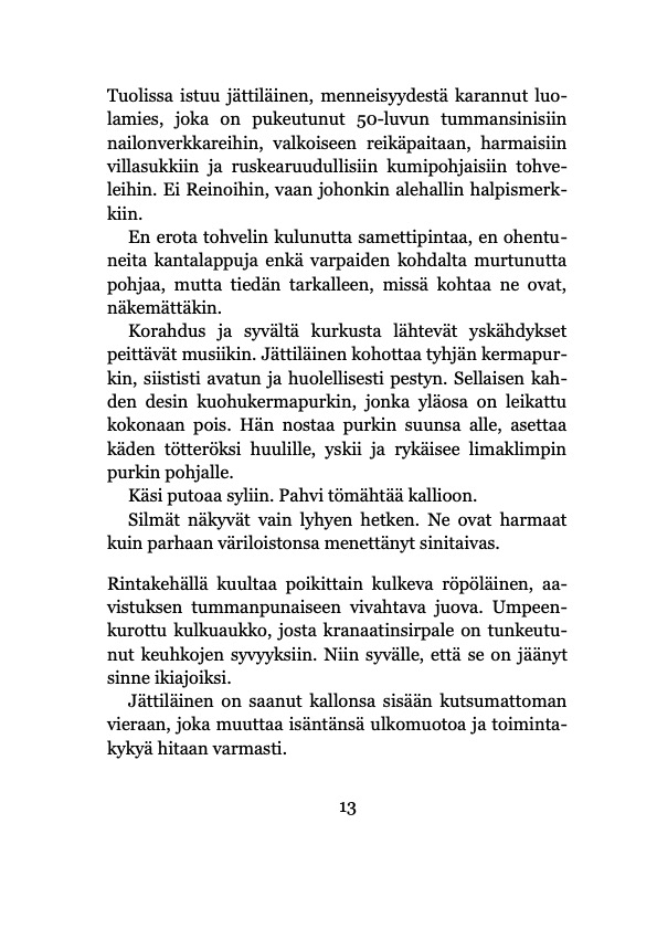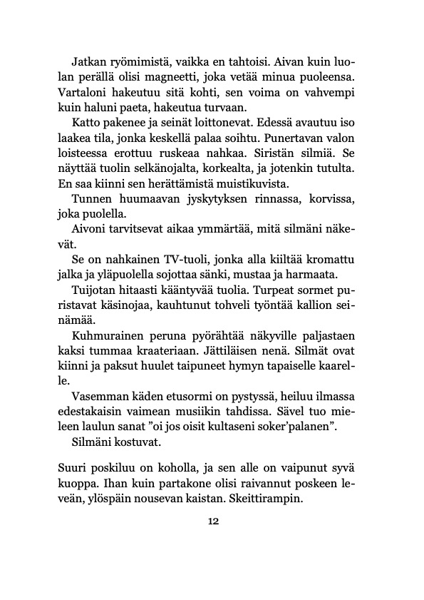 ”Vähitellen opin korjaamaan tasapainon heittelyä askeleiden avulla. Se alkaa sujua kuin hidas tanssi. Hikoilen, ja mies hikoilee. Suolaiset pisarat sulautuvat toisiinsa, muodostavat läpinäkyvän kalvon välillemme, liimaa meidät yhteen, mutta kuitenkin erilleen.”